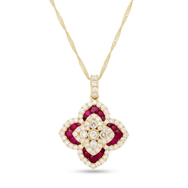 Unique design and detail in this beautiful and deep rich color Ruby & Diamond pendant with 20 Round Brilliant genuine Rubies for 0.55ctw & 73 Round Brilliant Diamonds 0.85ctw set in a stunning 14k yellow gold pendant & a diamond bail with a classic 14K yellow gold cable chain 16″ in length. Pendant is @ 3/4″ in length. RT#81907 Reg.$6250. Disc.$4695.