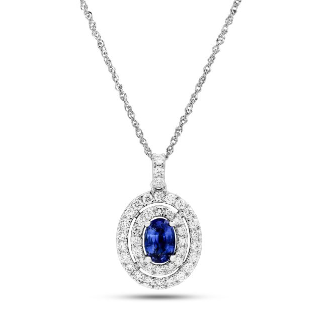 Stunning, beautiful, & deep rich color pendant with an Oval shape genuine Sapphire for 0.75cts set in a stunning 14k white gold double diamond halo mounting with 43 round brilliant diamonds for 0.58ctw and a diamond bail with a classic 14K white gold cable chain 16″ in length. Pendant is @ 3/4″ in length. RT#79718 Reg.$4350. Disc.$3295.