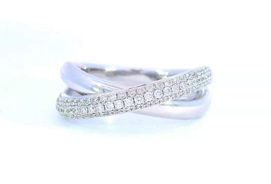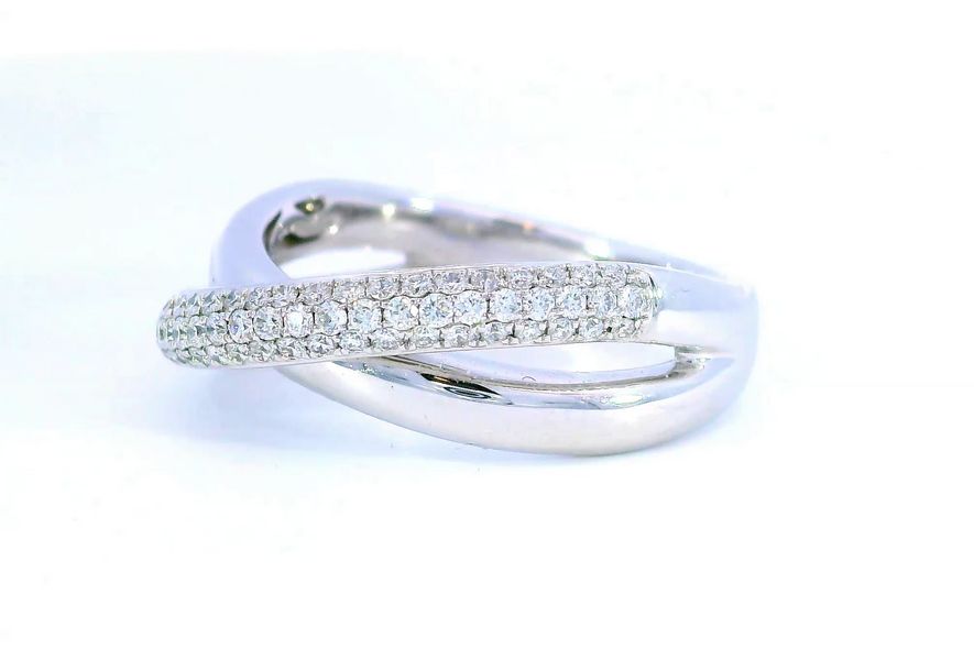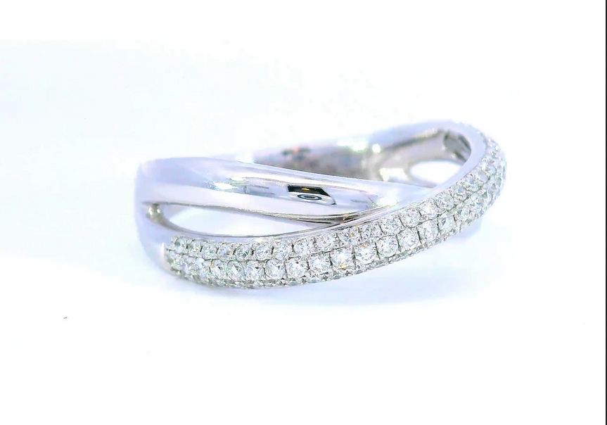 Perfect Right hand Ring describes this Cris Cross Diamond Fashion Band set with 0.43ctw of pave set diamonds in 18k white gold mounting size 6.5 #R19117802 Reg.$2950. Disc.$2195.